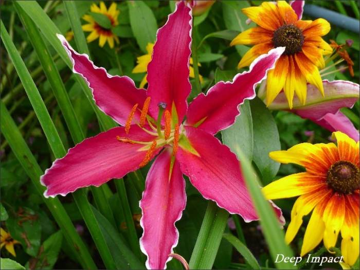 Дип Импакт- высота растения 125 см, цветок малиново-красный с темным крапом и зеленым горлом, края белые.