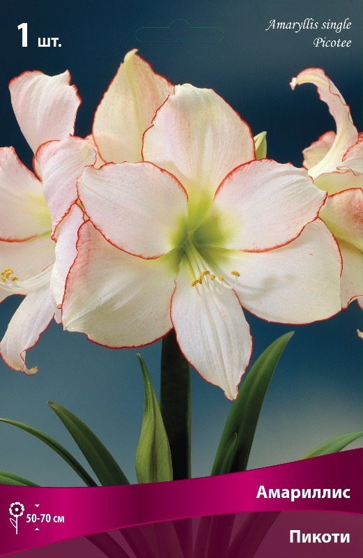 Амариллис Пикоти – многолетнее луковичное растение с длинными узкими листьями и высоким стеблем. Большие цветки имеют снежно-белый окрас, тонкий кант красного цвета и жёлто-зелёную серединку. Родом растение из Южной Америки. В условиях нашего климата цветок выращивают в комнатных условиях. Яркое растение внесёт изюминку в интерьер любого помещения. В длину растёт до 70 см. Одна луковица даёт до 3 цветочных стрел. На одной стреле вырастает 4-5 соцветий, диаметром около 15 см. Луковица имеет грушевидную форму, довольна крупная – в диаметре до 10 см.